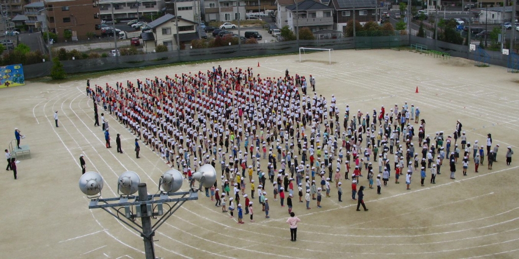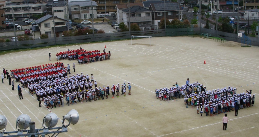 入退場の練習に、昨日の練習の成果が見られます。左の画像の隊形から右の隊形に移動します。本日も成長した姿が見られました。