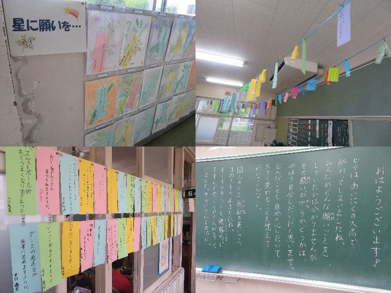 皆様のご理解・ご協力に感謝です。 さて、昨日は七夕でした。今朝、校舎内を回っていると、至る所に願いや夢を書いた短冊が飾ってありました。どの学年もコロナ関係の記述が目に付きましたが、「足が速くなりたい」「頭がよくなりたい」等、自分の目標について書かれたものもたくさんありました。中には、差別のない平和な世界を希求する短冊も何本かありました。