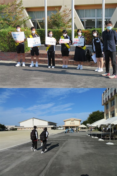 そのような中、日進中学校の安全委員が交通安全の呼びかけとともにあいさつを生徒に呼びかけています。少しずつ制限が緩和されているなかではありますが、子どもたちの意気込みをとてもうれしく感じます。片手距離の間隔をあけ、マスク越しですが状況を見ながら大きな声であいさつをしてくれる安全委員の皆さん、本当にありがとうございます。今後もよろしくお願いします。