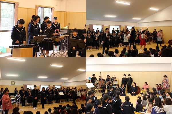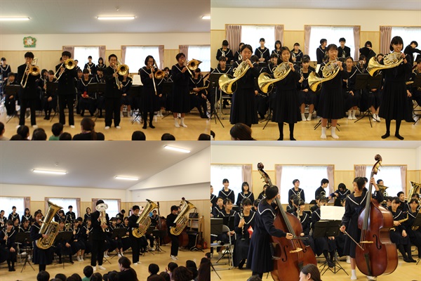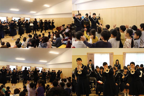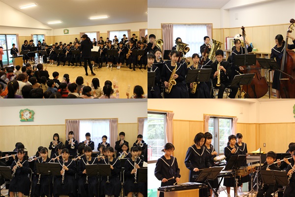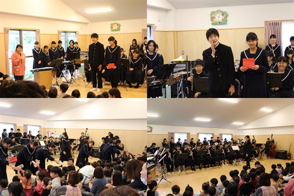 本日、吹奏楽部が「めばえ保育園」に行き、「クリスマス演奏会」を行いました。