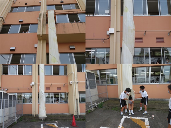 1年生の総合的な学習の時間で花里先生が防災に関する授業を行っています。その中で、日進中学校に設置されている避難救助袋の体験学習を行いました。(前回は、防火シャッターについて理解を深めました。) 災害が起きないことが一番良いのですが、有事の際に備えて訓練(体験)しておくことはとても重要です。15名ほどの生徒全員が救助袋の中を通りました。少し怖いと思っていた生徒もいましたが、袋を通過してきた後に感想を聞くと「入るまでは怖かったけど、入ってみると怖くはなかった。実際の時は落ち着いて降りられると思う。」と話していました。 話を聞くだけ、物を見るだけではなく実際にやってみることが生徒には実感がわくとともにより深く理解できると思います。 この体験が、本当に災害が起こった時に活かせるとよいですね。(災害が起きないことが一番良いですが・・・・・。)