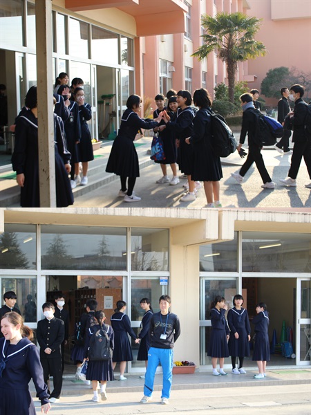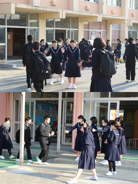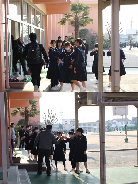 3年2組の有志が「あいさつ運動」を昇降口で行ってくれました。