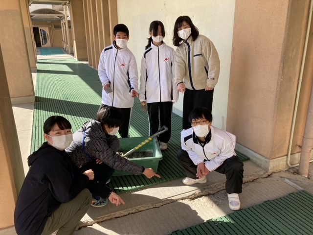 今日の技術は、塩ビパイプで「リコーダー入れ」を作る予定でしたが、体育館に向かう生徒が渡り通路の割れ目でつまづいている姿を見たので、急遽、モルタルで割れ目を埋めることにしました。