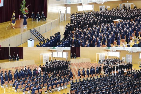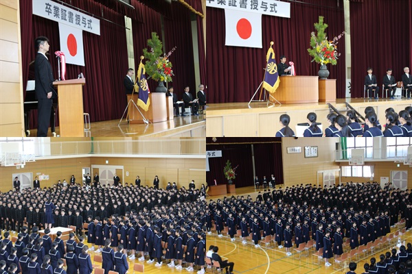 本日、絶好な卒業式日和に恵まれて、「平成最後の卒業証書授与式」を挙行しました。「日進中学校 第72回 卒業証書授与式」です。「厳粛な中にも、感動的な卒業式」でした。本番までは「子どもたちを褒めない!」と決めています。しかし、今日は「素晴らしい!!」「感動的な卒業式をありがとう!!」最後の最後まで、「まだやれる!!」「まだやれる!!」と言い続け、子どもたちにも、先生方にも「今までの殻を破らせたい!!」「新しい世界を見せてあげたい!!」の一心で!!準備から、本番まで接してきました。一生懸命の「子どもたちの姿」は、見ている人の「心」を揺さぶります。1・2年生の送辞の歌で「泣けてきた」のは、教員人生「初めてでした!」そして、3年生の答辞の歌では、涙をぽろぽろ流しながらも、一生懸命歌う姿も「泣けてきました!」3年間が「走馬燈」のように、駆けめぐってきたのでしょう!「目を真っ赤に腫らして」一生懸命歌っていました。答辞でも場面場面で、涙ぐむ子どもたちがあちらにもこちらにも・・・・・。最後の校歌は、泣けて泣けて歌えませんでした。思いのこもった、泣けてくる3年間をともに過ごすことが出来、幸せでした。ありがとう!!日中健児!!保護者のみなさま!!そして、地域のみなさま!!さらには、教職員のみなさま!!心から感謝申し上げます。本日をもって、3年生は「卒業生」となり、「天下の日進中学校」を旅立ちます。今まで、様々な場面で支えていただき「ありがとうございました!」親愛なる日中健児3年生のみなさん!!今日からは、「天下の日進中学校の卒業生」として、日進中学校を支えてくださいね!!また、あなたたちが「この日進市の地で!」保護者となり、その「子どもたちが」日進中学校に帰ってきても、「安心して預けられる学校となるよう!!」今後とも、精進していきたいと考えています。いろいろな意見を聞かせてくださいね!!残された日中健児のために・・・・・・・・・!!最後に、このような卒業式ができたのも「一重に、保護者・教職員のみなさん」が、愛情もって子どもたちを育てて頂いたから!!と・・・・!しみじみと感じた式でした。卒業生も在校生も、みんなで「感じた」式でしたね!!いろいろと、ありがとうございました!!そして、1・2年生のみなさん!みなさんが支えて頂いた「おかげ」で、感動的な式になりました。ありがとう!!明日からの「3週間」が、みなさんにとっては「大切な3週間ですよ!」期待しています。がんばれ!!日中健児!!