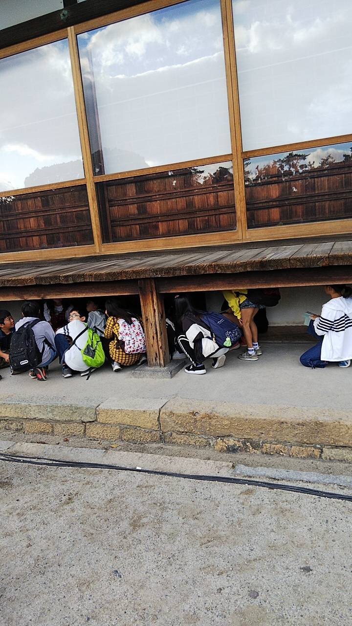 右の画像は説明が必要ですね・・・二条城のうぐいす張りの音を聞くため、もぐっているところだそうです。