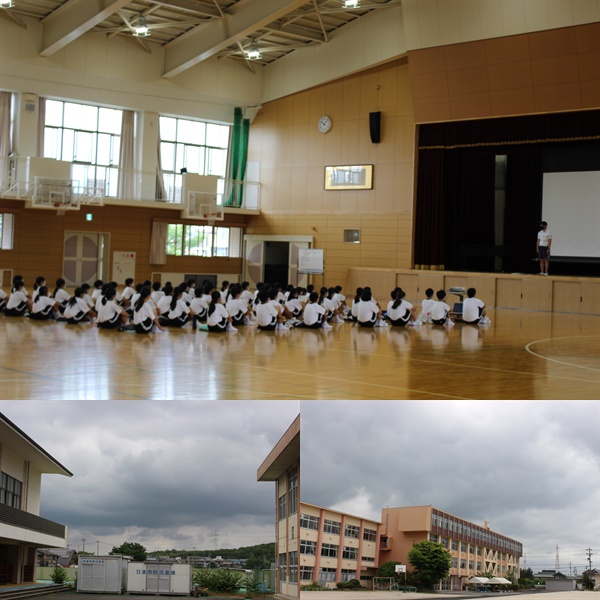 雨は、降っていませんが、体育館で「授業を受けるにあたって!」の