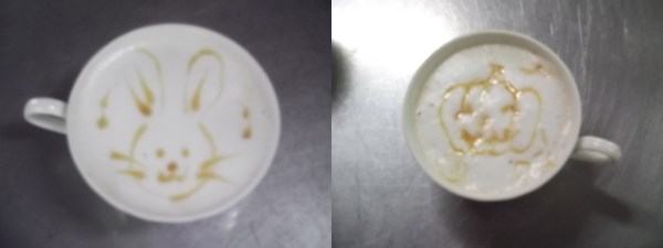 最後に、ミルクを泡立ててカプチーノを作り、キャラメルソースでお絵かきに挑戦です。