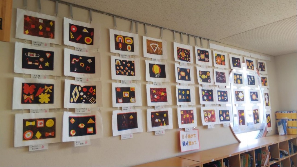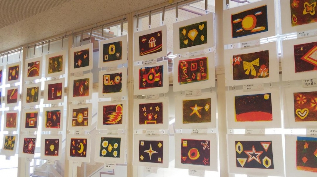 現在、5年生の廊下には図工で取り組んだ多色刷り版画の作品が飾られています。形や色、材料の特徴、構成の美しさなどを考えながら、下絵をかいて、色の付け方や彫る順番を工夫して作品づくりを行いました。どれも味わい深くて、作者の思いが上手に表現できています。力作ばかりです。