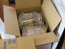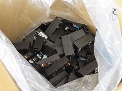 (↓ インクカートリッジの仕分け、詰め込み作業:キャノンのカートリッジです)