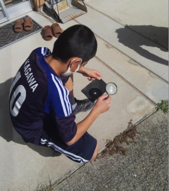 大人の皆さんなら一度はやったことがあるでしょうか。虫眼鏡で太陽の光を集め、黒い紙がこげるほど熱くなる実験です。こういう学習では、子供たちの「やりたい」を学びにどうつなげるかが教師の腕の見せどころになります。「光の円を大きな円からだんだん小さな円にするとどうなるかな」、「焦げるほどだから何度ぐらいかな」、「光の当て方はどうやったらいいのかな」など子供が自分から考えたくなるように仕向けているのがさすがだなと感心します。