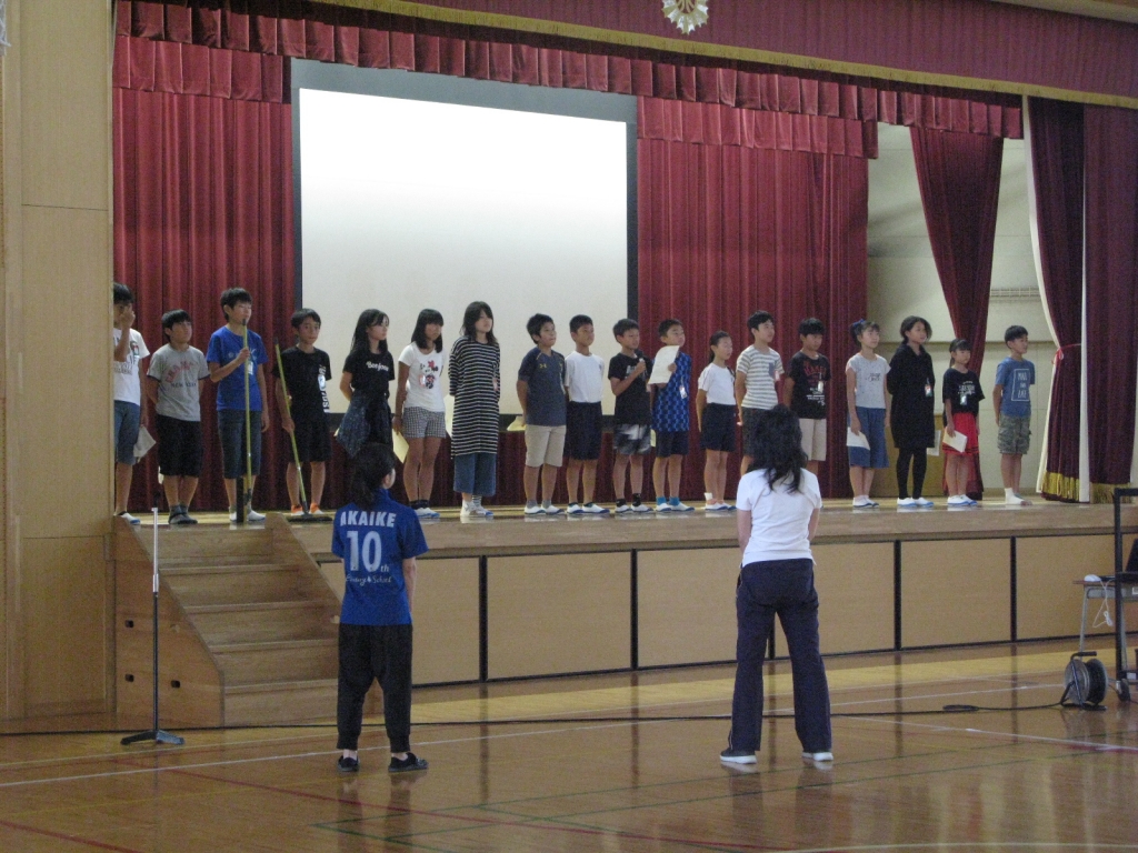 体育館では美化委員が集会のリハーサル中です。美化委員はハッピータイム中に階段などの校舎内美化という尊い活動を続けています。その思いが集会で伝わると良いと思います。