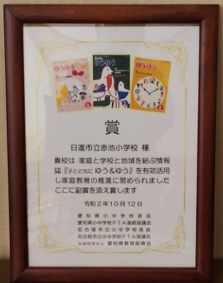 赤池小が「子とともに ゆう&ゆう賞」を受賞しました。「子とともに ゆう&ゆう」は愛知の子供たちの健全な育成を願い、PTA機関誌として昭和30年に『子とともに』として創刊されました。その後、平成14年度に新書名「子とともに ゆう&ゆう」となりました。親の役割や家庭のあり方など、親と子の問題を幅広くとらえ、学校・家庭・地域を結ぶ懸け橋となるようにつくられています。赤池小PTAや家庭教育推進委員会、それに地域の皆様のお支えが受賞につながりました。ありがとうございます。