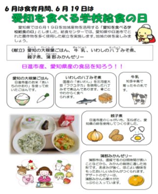 これらがわかる啓発ポスターを「愛知の大根葉ごはん、牛乳、いわしの八丁みそ煮、親子煮、蒲郡みかんゼリー」です。ごはん、じゃがいも、玉ねぎは、日進市産です。