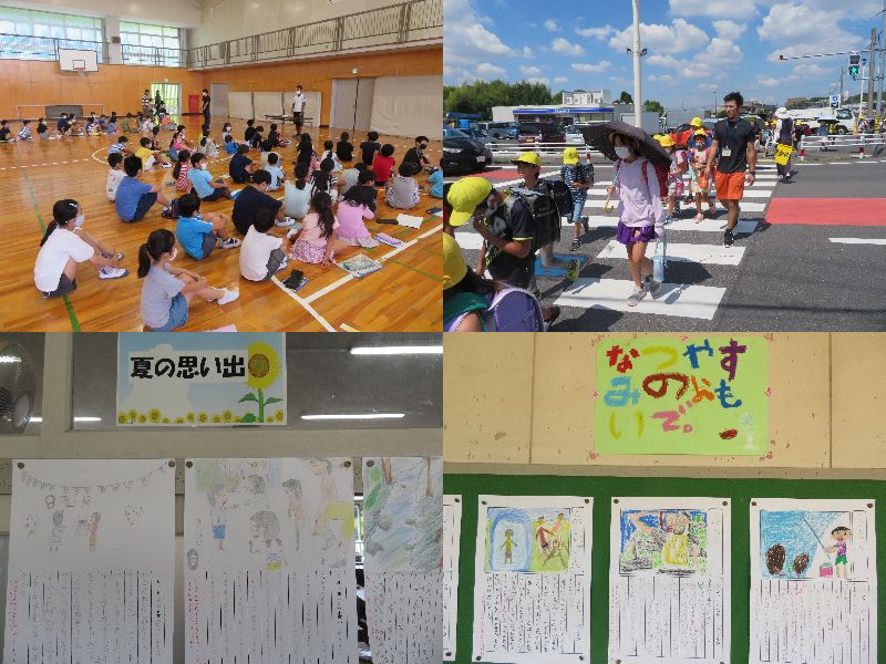 これからも、先頭の分団長、最後尾の副分団長を中心に、安心・安全な登下校を心掛けてほしいと思います。 また、廊下に「夏休みの思い出」が飾られてる学級がたくさんありました。例年より短く、ステイホームが中心の夏休みとなりましたが、それぞれの家庭で工夫して過ごしている様子が伺えました。