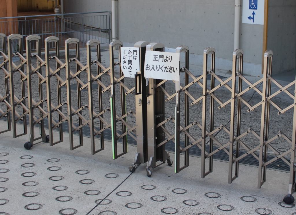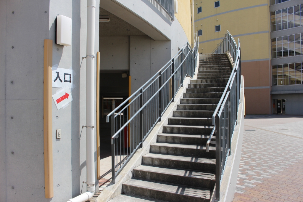 駐車場門ではなく正門を出入りしていただきます。正門を入って右の階段から体育館へ入ってください。