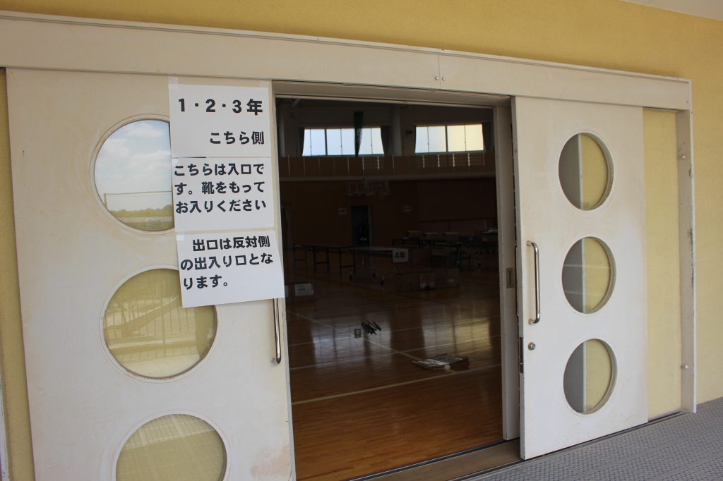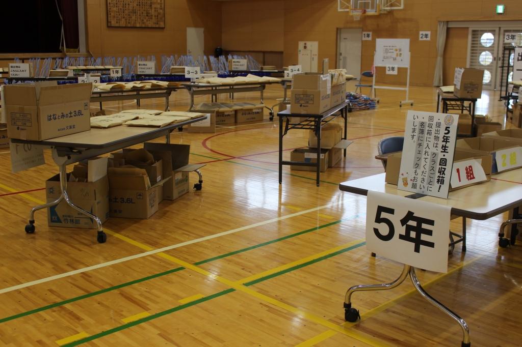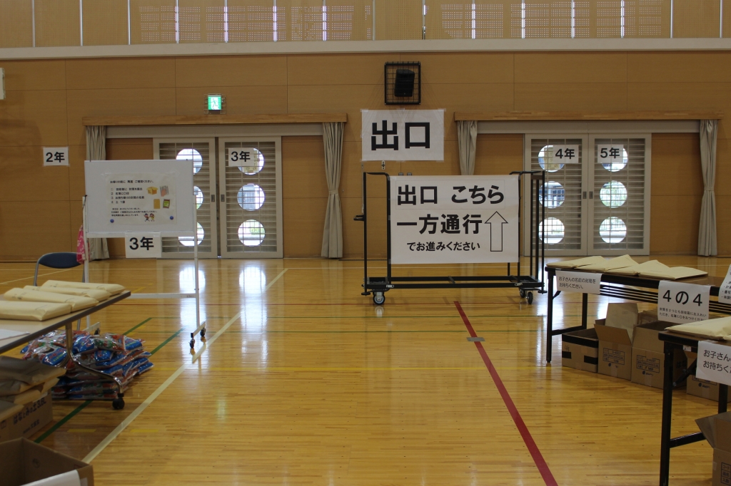 体育館内は一方通行で正面が出口になっております。下足を入れて運ぶビニル袋をご持参いただくと配付物の持ち運びが楽だと思います。