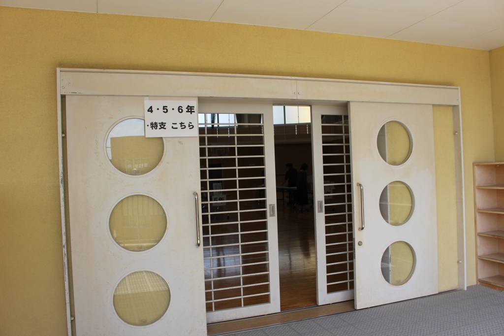 手前の入口が1、2、3年生 奥の入口がが4、5、6年生、やま・たけ・すぎとなっています。