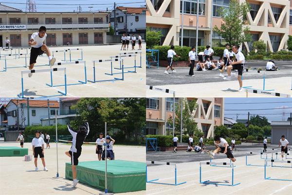 炎天下ですが、2年生が男子「ハードル」、女子「高跳び」の授業をしていました。