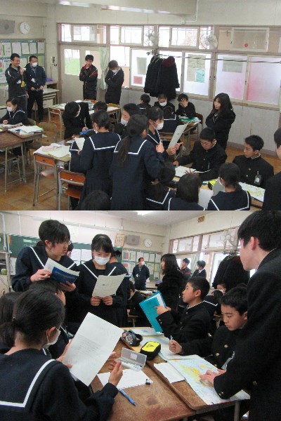 4時間目に1年生の社会の授業で先生同士の授業参観を行いました。