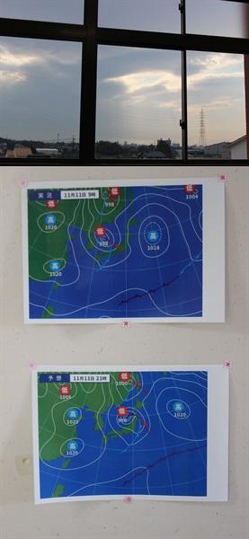 廊下には「寒冷前線」が通過する、本日の天気図2枚が貼ってありました。