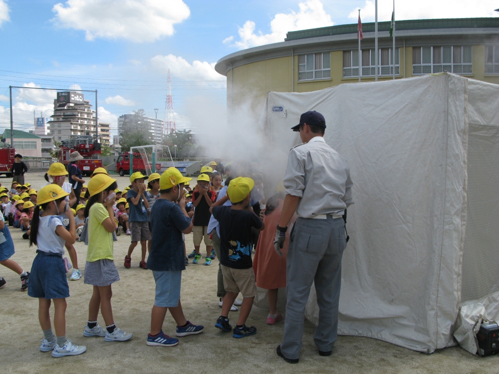 低・中・高学年に分かれて、それぞれ煙道体験、消火体験、救助体験をしました。命を守るために知っておくべきことはたくさんあります。そのうちの基本となることを学びました。