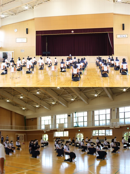 全員が体育館に入る前に「手洗い」をして入場しました。