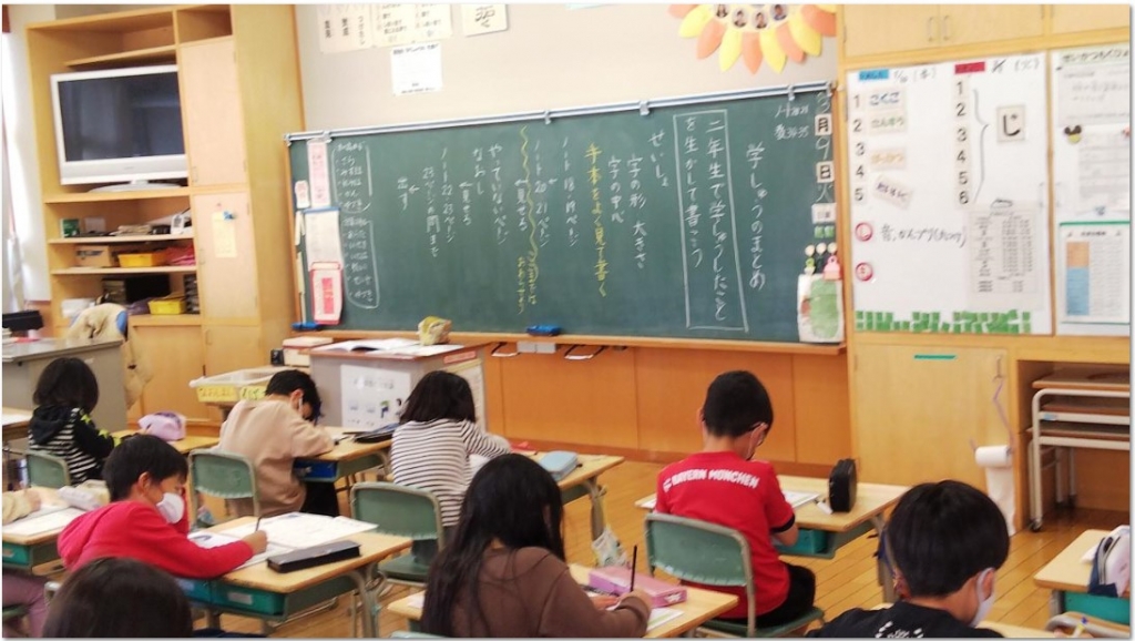 2年生の教室では、1年間の学習のまとめを行っていました。字の形や大きさを意識して集中して取り組みます。教室の雰囲気から皆の真剣さが伝わってきます。成長を感じます。皆、しっかりとおわることができるよう取り組んでいます。