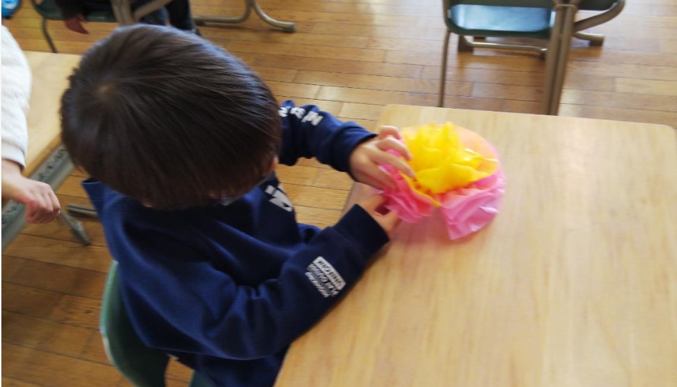 1年生の教室の前を通ると飾り付け用のお花を一生懸命につくっていました。4月の入学式用で、新1年生のためのものです。「皆、1年って早いね。これで新1年生を迎えられるね。もう立派な2年生だね」と話すとすごくうれしそうです。
