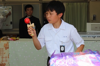 最後は、「球」の穴に「けん玉」の軸を回して「逆に入れる技」を教えました。