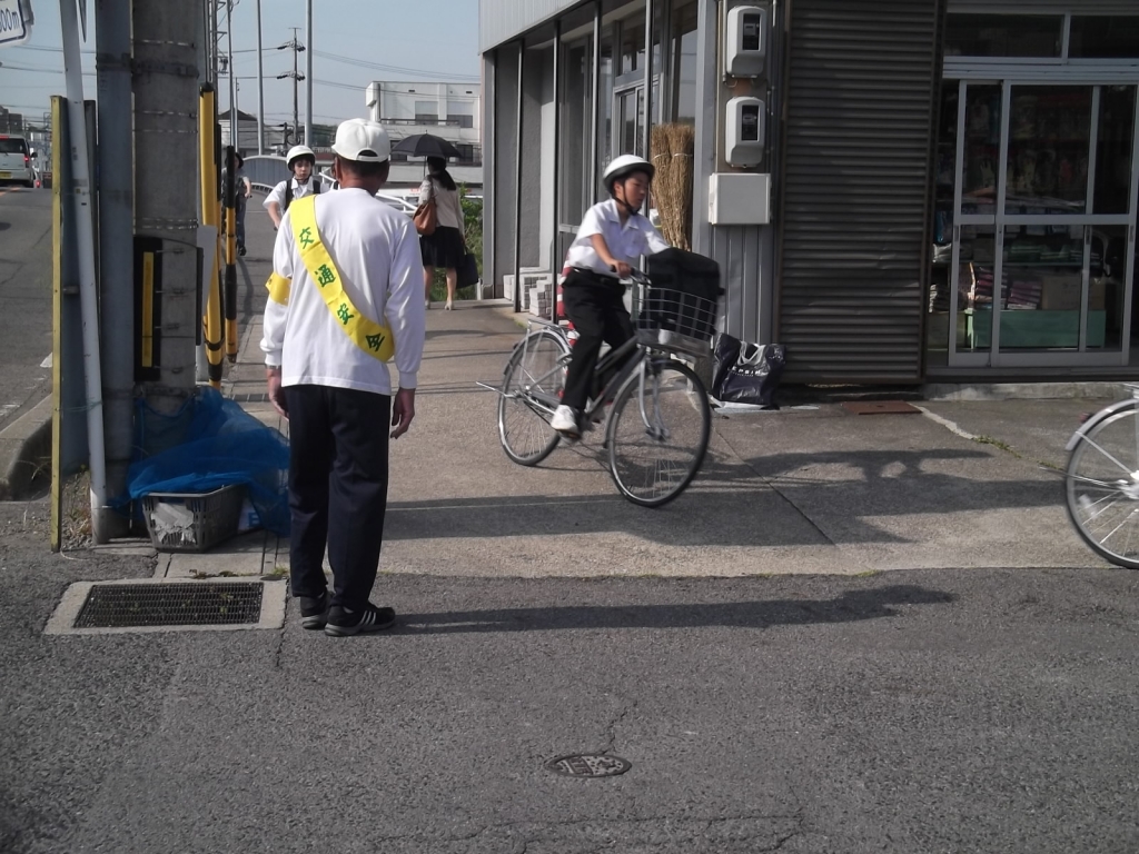 学校南側の稲熊建材前です。自転車通学の生徒は、給食センター方面に曲がっていきます。徒歩の生徒は、直進して学校に向かいます。車が通るたびに、上手に交通整理してくださりました。