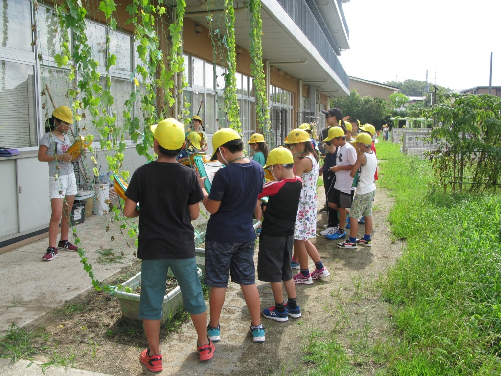出校日の様子です。教室で夏休みの報告をしたり、外で植物の観察をしたりしました。