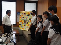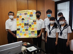 昨年度から本年度にかけて、「楽器ふるさと納税」等で、市内の方々にたくさんの楽器を寄付していただきました。その感謝の気持ちを伝えたいと、2・3年生の部員全員が手紙を書きました。先日、3年生の代表5名が市役所に伺い、手紙を教育長に手渡してきました。この手紙はしばらくの間、市役所1階のエレベーター付近に掲示していただきます。
