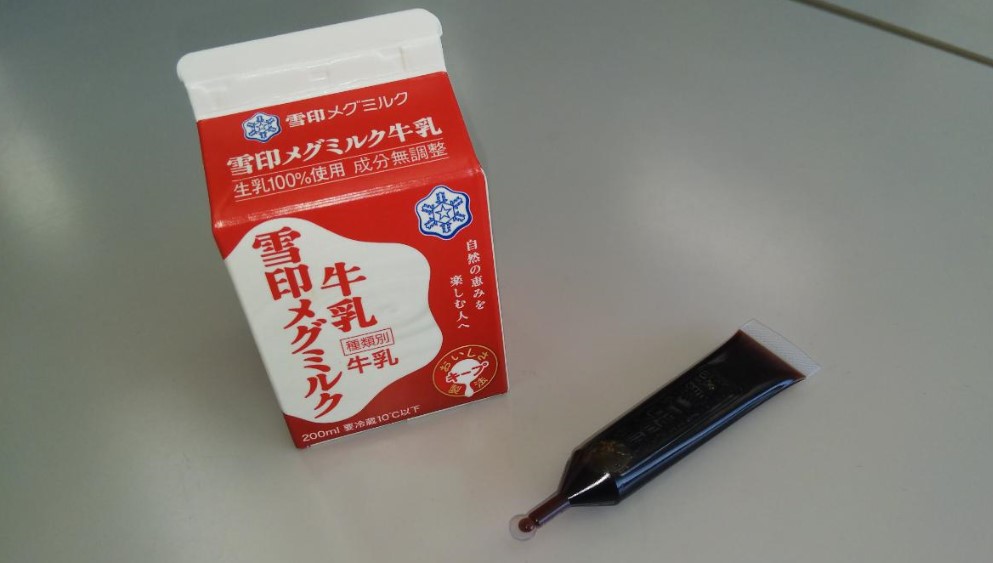 本日の給食でミルメークが出ました。今年度から給食の牛乳が紙パックでの提供になりました。それで、ミルメークは粉のものから、液体タイプ