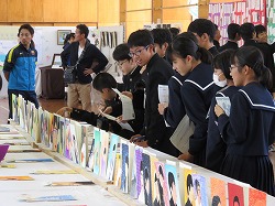 今日は各学年で時間を決めて生徒みなさんの力作をゆっくり鑑賞していました。学年が上がるにつれてクオリティーも高く、また技も随所に見られる作品が多かったです。