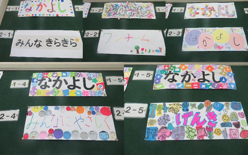 誹謗中傷やいじめ・差別を絶対にしてはいけませんね。 それでは、1・2年生の学級目標を紹介します。1年生の学級目標は、1組から5組まで全て「