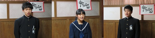 (左の写真は代表生徒の3名です。左から1年杉本さん、2年磯村さん、3年出下さんです)