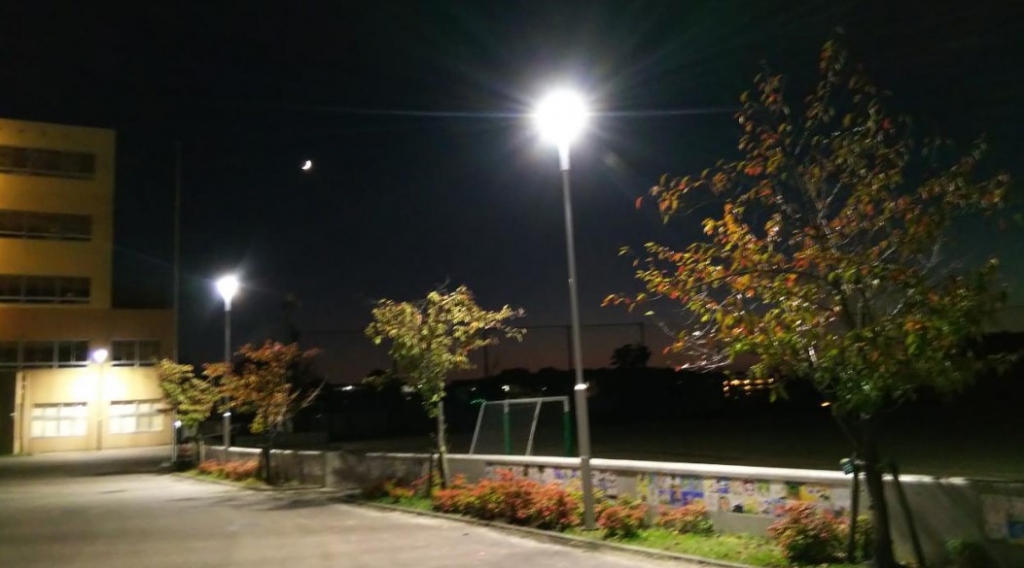 写真は昨日18:00頃の赤池小の様子を撮影したものです。桜の木の葉が色づき始め、照明に照らされきれいでした。