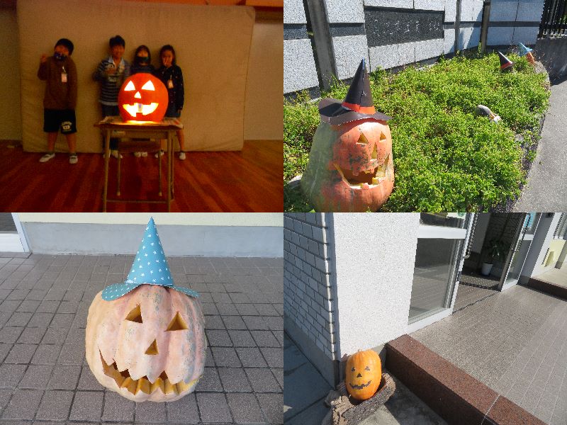 特別支援学級の子どもたちや教員が協力して製作したものです。本日の3・4時限目、「そら組」でハロウィンパーティーが開かれました。子どもたちは、○×クイズ等のゲームを楽しんだり点灯したジャック・オー・ランタンを味わったりしていました。