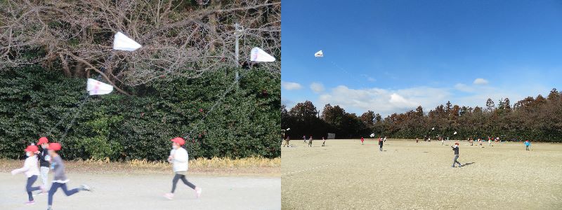 昨日までの暖かさから一転して、今日は風が強く肌寒さを感じました。そんな中でも、子どもたちは元気いっぱいに凧揚げを楽しんでいました。室内遊びが主流の昨今、昔の遊びは子どもたちにとって新鮮なようです。
