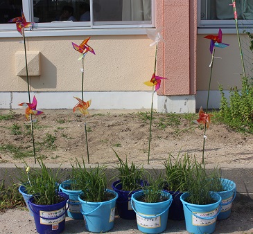また、「鳥よけ」として、カラフルな風車をバケツの上に設置しました。