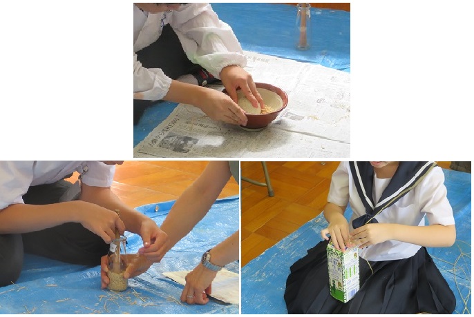 精米は牛乳瓶を棒でつついて行います。これが大変な重労働でした。なかなか売っているような白いお米にはなりません。予定より2時間もみすり、精米の時間を増やしました。生徒たちはおいしいお米を食べるためによく頑張りました。