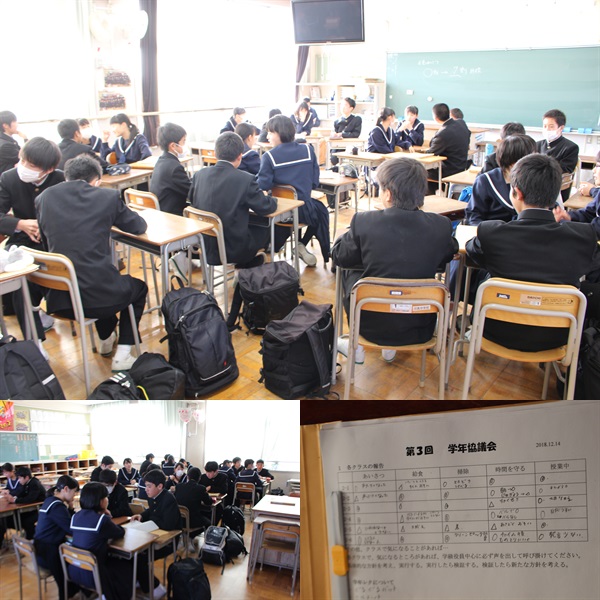 1年生と2年生が「あいさつ推進」の話し合いをしていました。