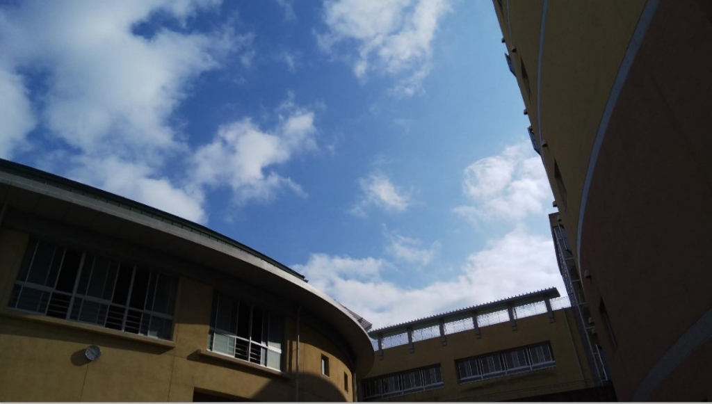 本日も暖か、というより時間によっては暑さを感じる一日になりそうです。校舎と体育館の間からのぞく空がすてきなので一枚撮りました。