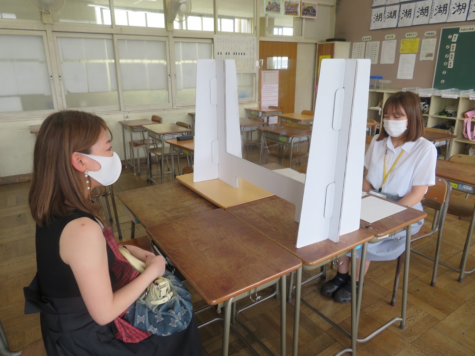 昨日から、児童下校後に各教室で、個人懇談会が実施されています。コロナ禍が身近に迫っている中、学校までお越しくださりありがとうございます。学校としても、換気やマスクの着用、消毒液・卓上シールドの設置等の感染防止対策を実施して、安心・安全に懇談が行えるよう配慮しています。担任より、お子さんの学校での様子等についてお話させていただきます。