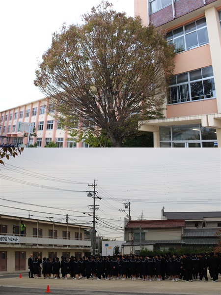 この季節になると、昇降口付近の木から「落ち葉」が雨のように「パラパラ」落ちてきます。