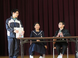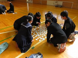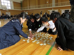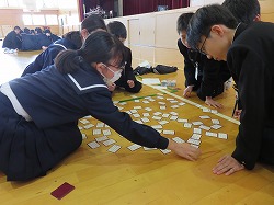 百人一首は平安時代から鎌倉時代の100人の歌人の和歌を一首ずつ選んで作られた物です。実行委員が詠み手になって、グループに分かれて何枚とれるか競っていました。グループによっては一文字目で反応するところもありました。詠み手の実行委員もプロ顔負けの上手な詠み方でかなり練習していたのだと思いました。(実行委員のみなさん、お疲れ様!)