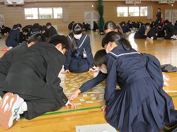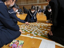 今日はその学習のまとめとして百人一首大会が行われました。小学生ならば「いろはカルタ」で遊ぶことが多いですが、、中学生になるとレベルが上がって百人一首を楽しむことが多くなるでしょう。