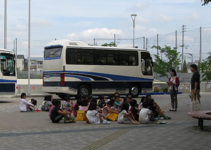 右の画像は3年生が校外学習へ出かけるところです。今年から日進市のバスは全席が確実にシートベルトをしめられるよう、乗車定員が限定されています。でも、校外学習から得られることはたくさんあるので、工夫して乗車しています。今回は市内の施設、市内各地区の特徴について学んできました。