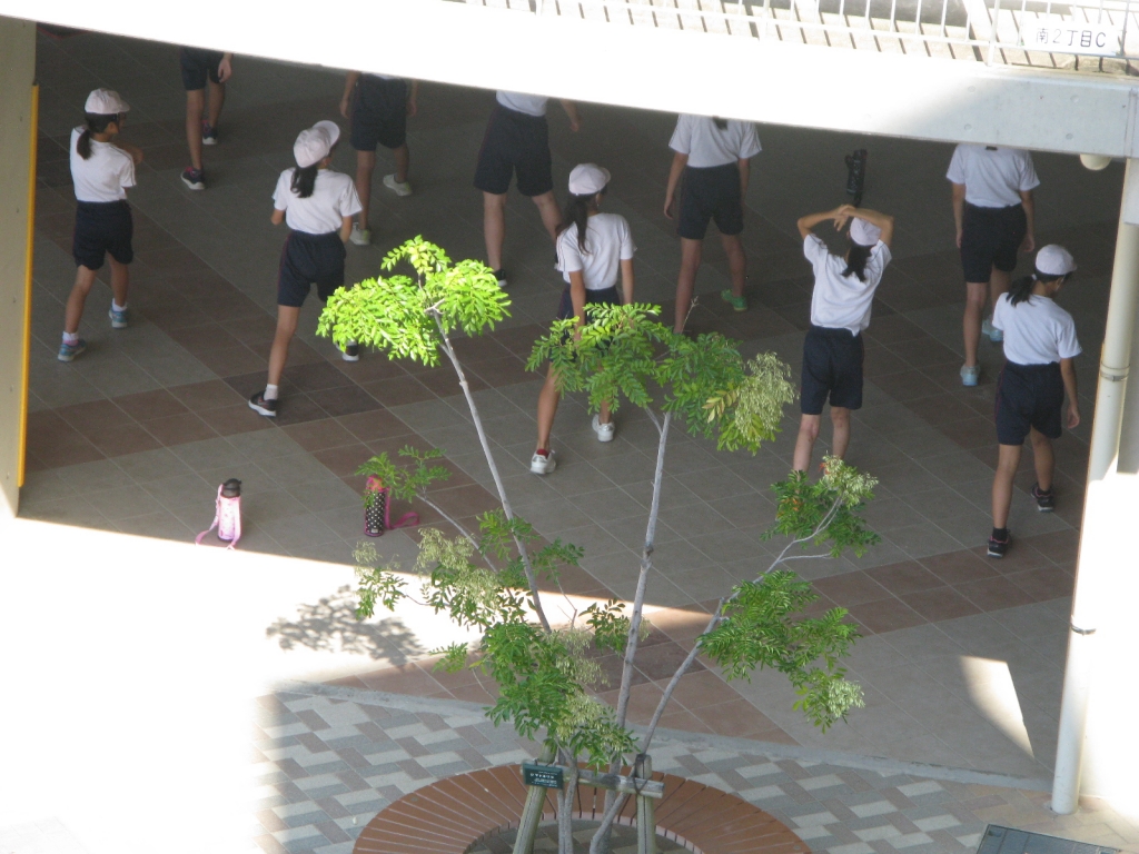 5時間目の体育は準備運動を日陰で行いました。残暑、厳しいです。