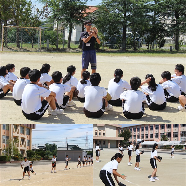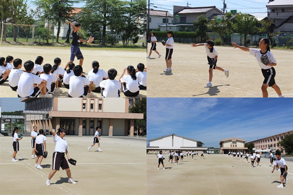 1年生が「野球?」「ソフトボール?」の授業をしています。